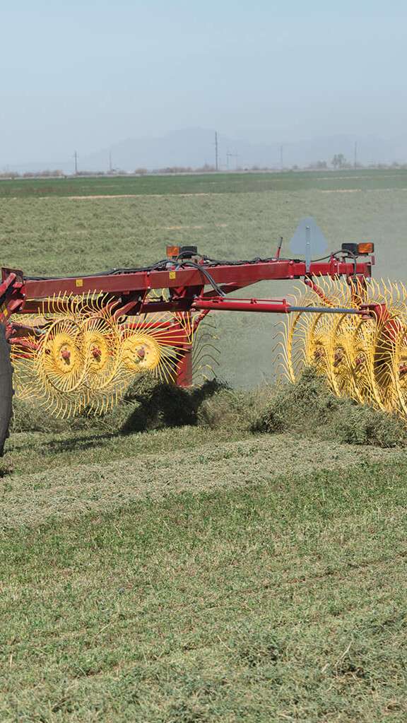 New Holland DuraVee™ trailing wheel rakes are the right choice for high-capacity haymakers looking for a fast way to move more hay. Offered in five models with raking widths from 17’ 5” to 31’, these rakes are perfect for many different sizes of haymaking operations. Simple adjustments mean you rake all of your crop and head down the road quickly when you’re finished. Strengthened components, like thick frames and heavy-gauge steel tubing for wheel supports, enhance durability so DuraVee rakes withstand high-speed operation in varying field conditions.