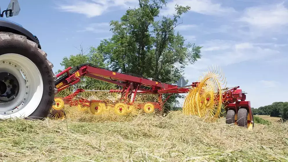 All DuraVee™ rakes feature 55-inch raking wheels with 40 7-millimeter tines per wheel. For additional overlap and increased raking ability in heavy crops, select the optional 60-inch rake wheels that are available on the DuraVee 1225, 1428, and 1631. These wheels have stiffer 7.5-millimeter tines that deliver better ground engagement for a more positive drive.